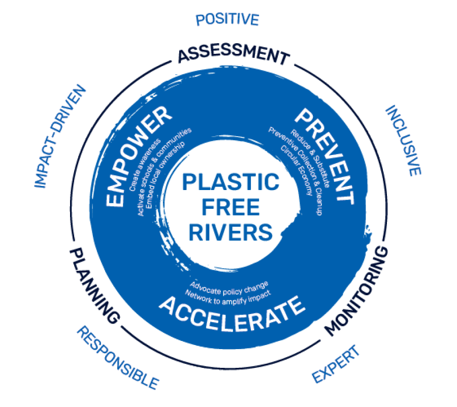 The logic is based on a simple and effective strategy: early intervention. Plastics that are not produced never become plastic waste. Collecting post-consumer plastic waste prevents leakage and pollution of the environment. Cleaning up plastic leakage on land prevents plastic pollution of rivers and increases the options to reuse these plastics in closed-loop circular economy solutions. Finally, cleaning up plastic pollution from rivers is the only solution to prevent it from further polluting nature and the ocean.